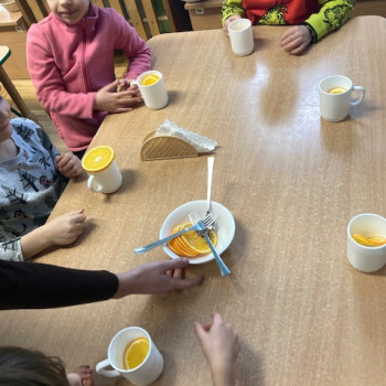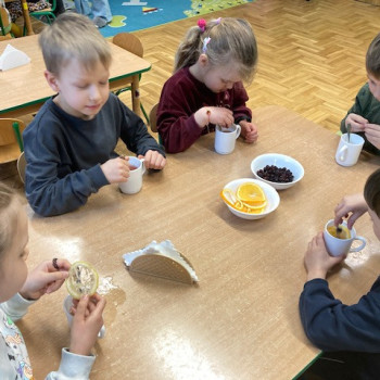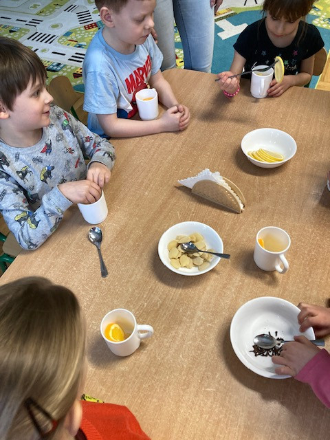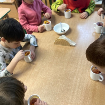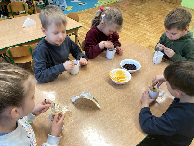 W dniu 28.01 odbyły się w naszym przedszkolu warsztaty kulinarne pt  „Aromatyczne, zimowe smaki”. Podczas zajęć przedszkolaki z grupy III i IV  poszerzyły  wiadomości na temat zdrowego odżywiania się i komponowania zdrowej rozgrzewającej herbatki.