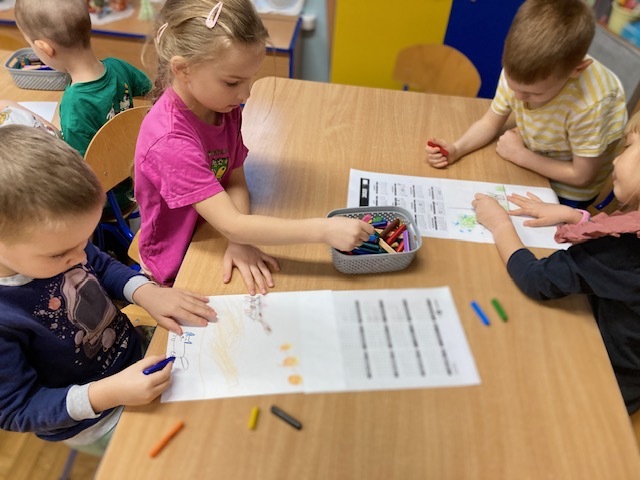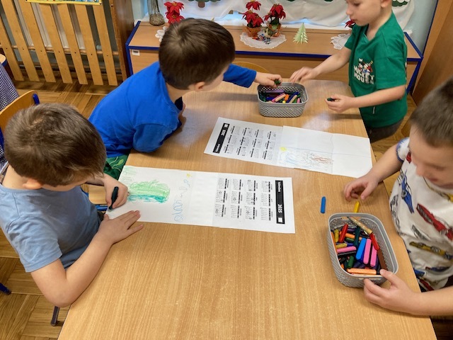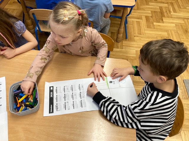 Rozbudzanie wyobraźni plastycznej. Doskonale umiejętność plastycznych, graficznych. Współpraca w parach, wspólne rysowanie , projektowanie rysunku na kalendarzu.