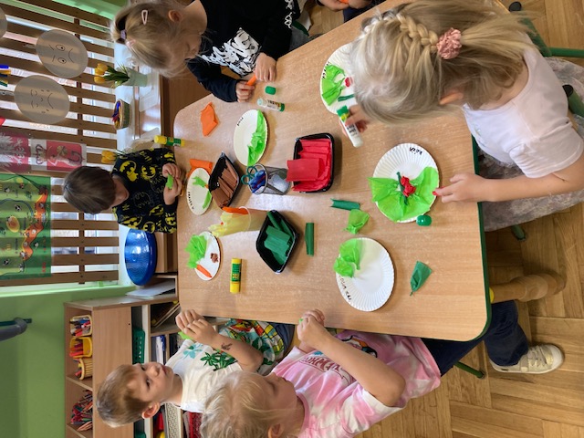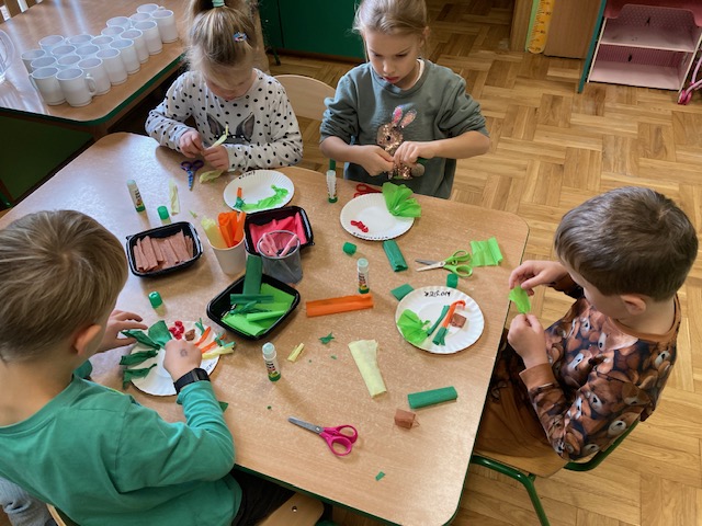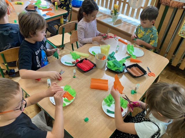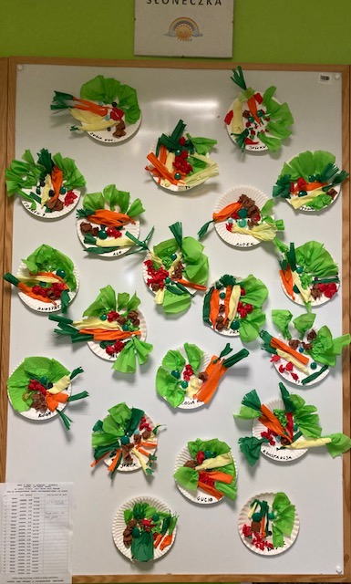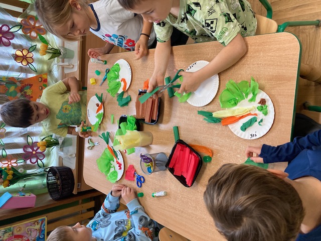 Dzieci utrwaliły nazwy i wygląd warzyw, wykonały je z krepiny, ułożyły i przykleiły własną kompozycję na talerzyku tworząc pracę półprzestrzenną.