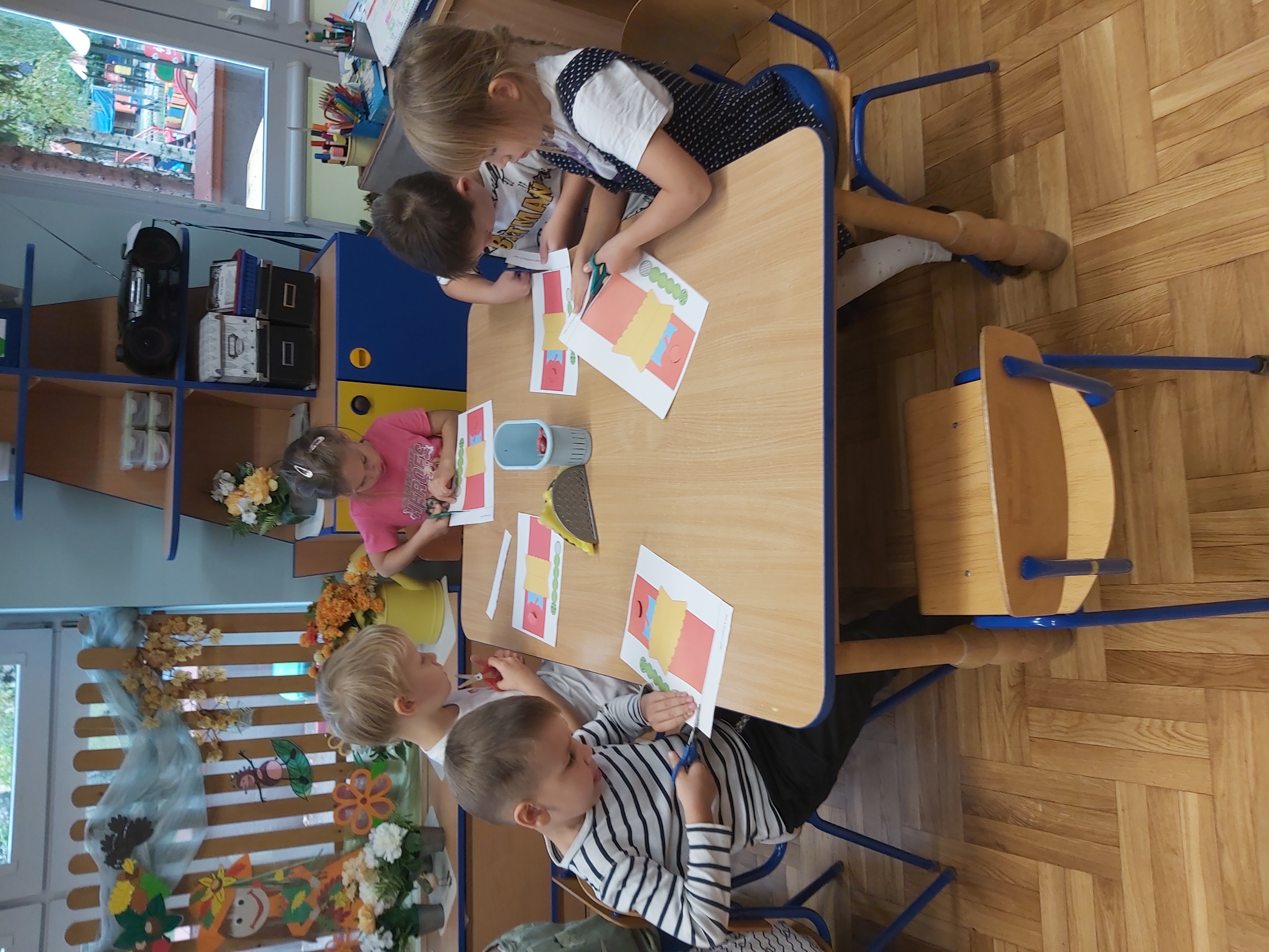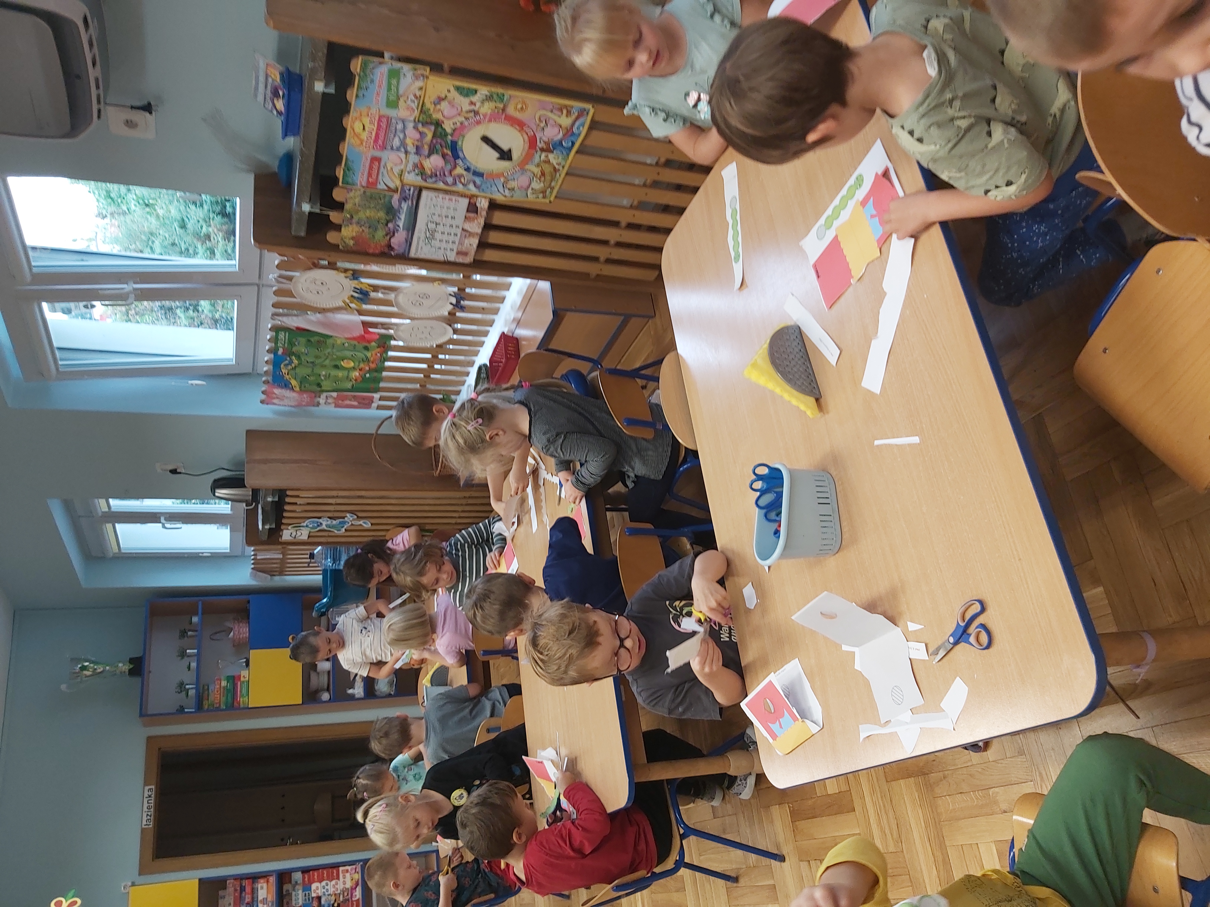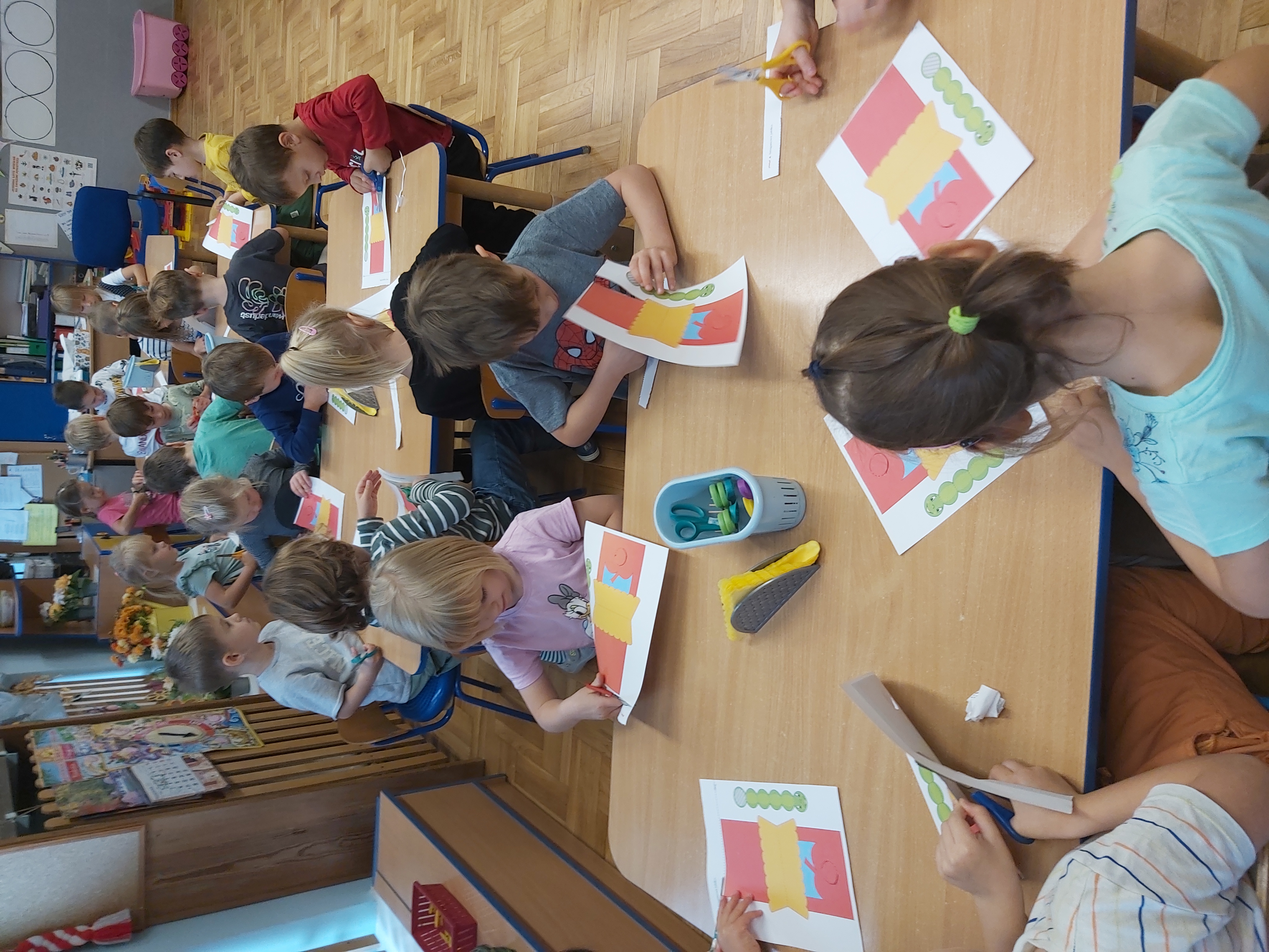 "Słoneczka" bawiły się z rymowanką " Entliczek pentliczek" a następnie wykonały domek dla robaczka. Doskonaliły pamięć, koordynację słuchowo-ruchową a także sprawność manualną podczas wycinania.
