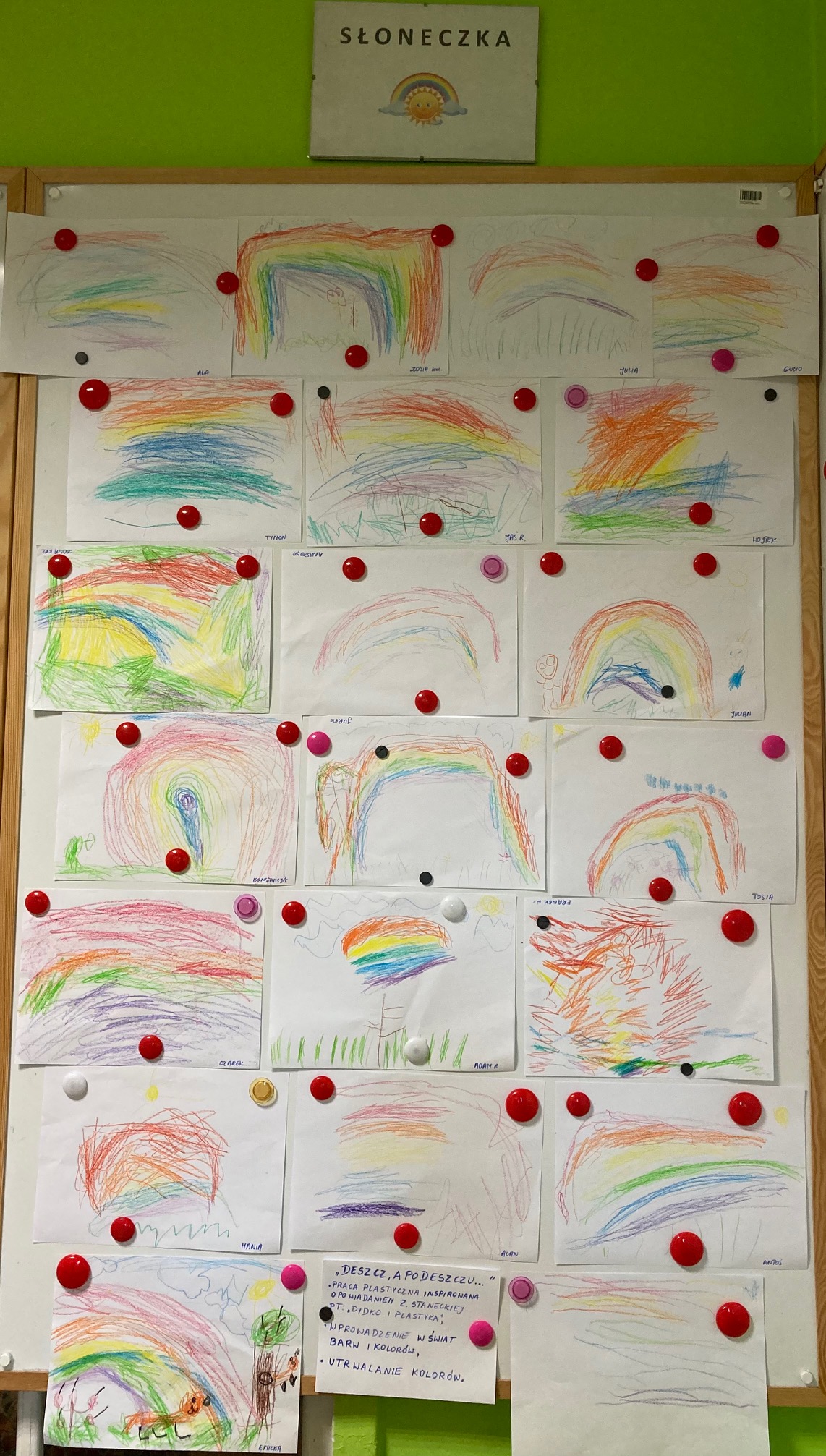 Jesteśmy grupą dzieci sześcioletnich, nazywamy się SŁONECZKA. Dobrze czujemy się w przedszkolu, do którego uczęszczamy już czwarty rok. Pełnimy funkcję prawdziwych gospodarzy – dbamy o swoje przedszkole i pomagamy młodszym koleżankom i kolegom. Zdobywamy wiedzę i nowe umiejętności podczas zabaw i zajęć przedszkolnych. Uczymy się zgodnego współdziałania w zespole, poznajemy literki, próbujemy czytać i liczyć.