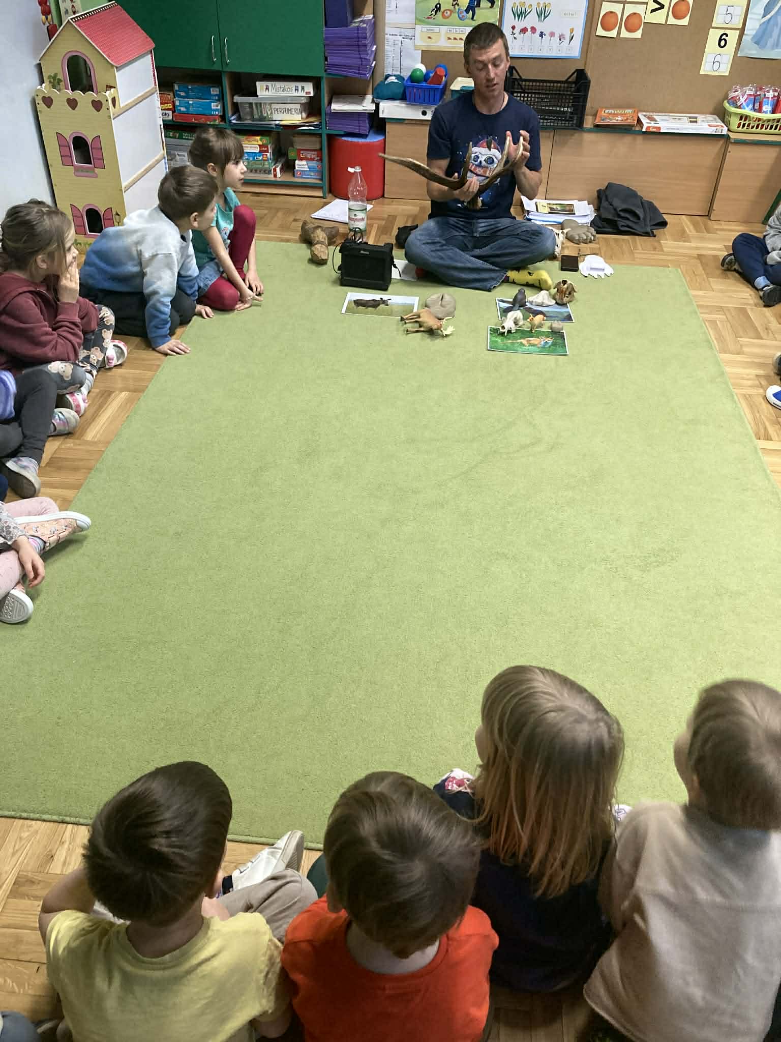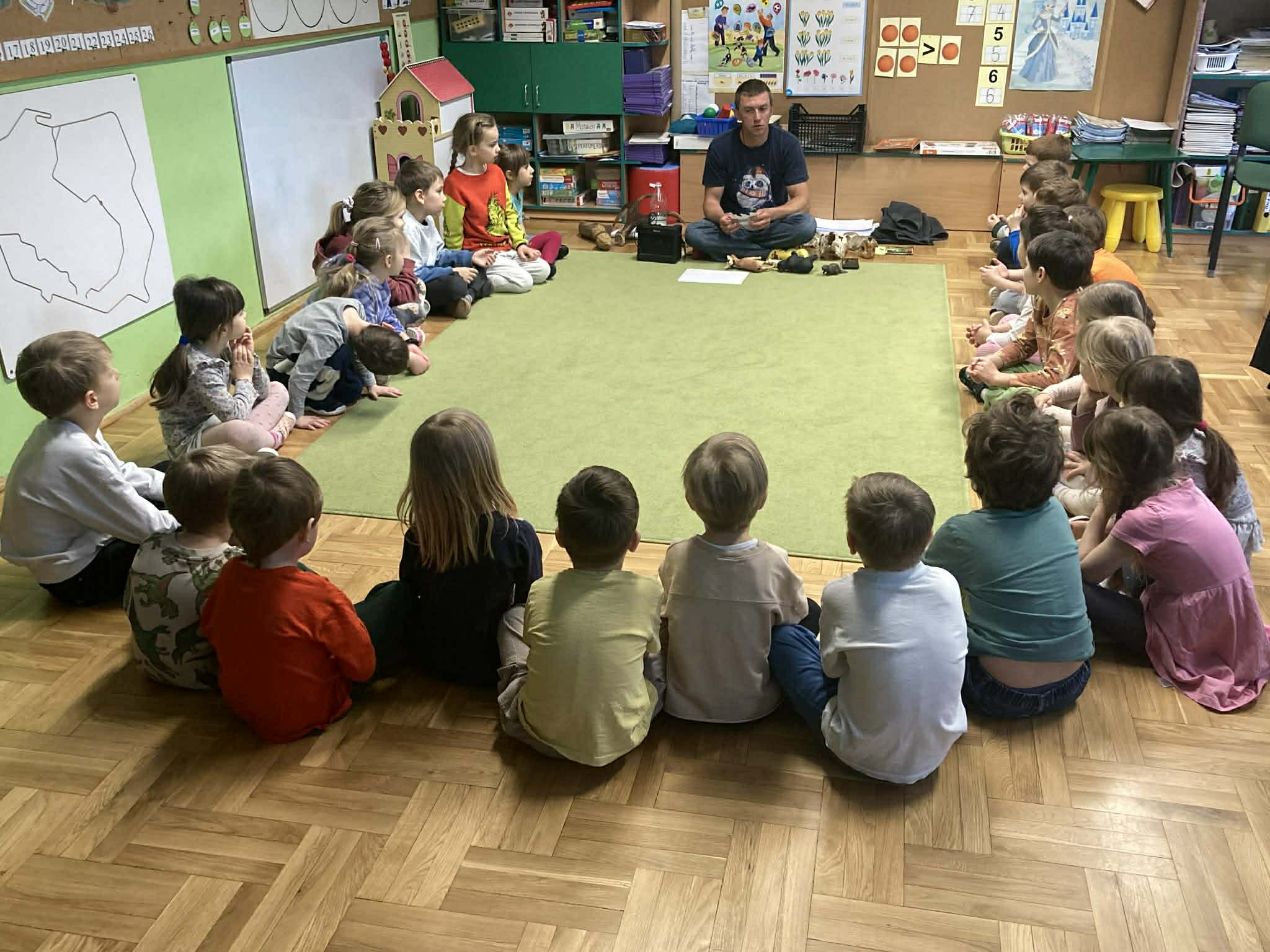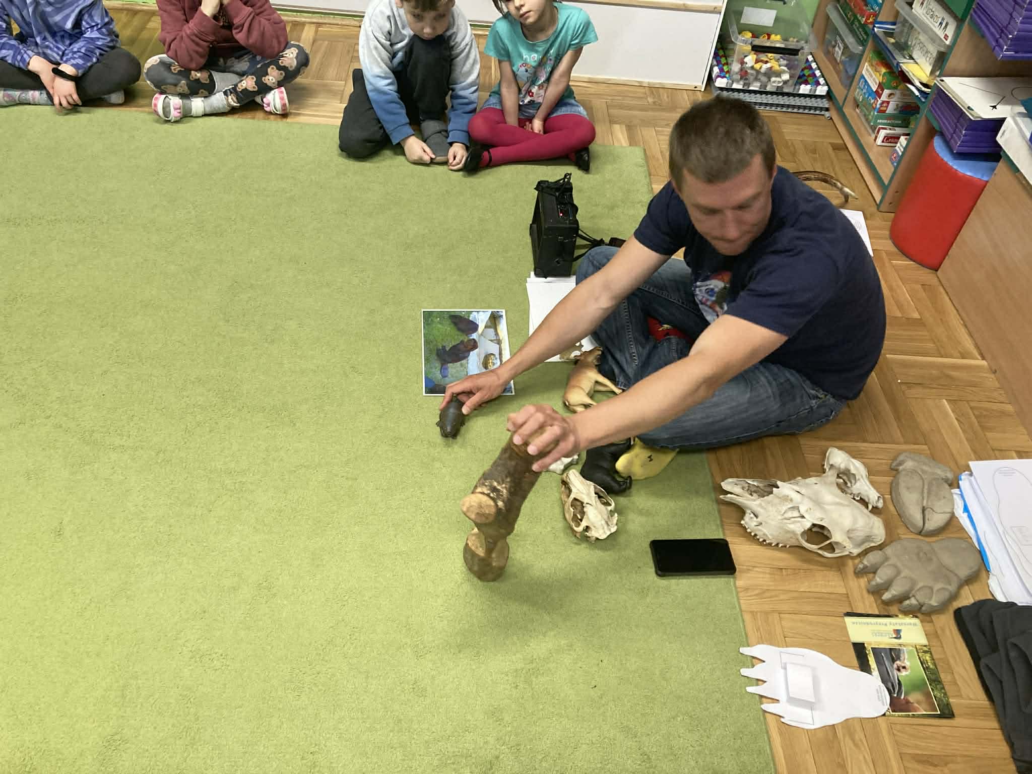 Przedszkolaki z grup Słoneczek i Krasnoludków wspólnie brały udział w warsztatach przyrodniczych pt ,,Na cztery łapy". Podczas warsztatów pan przyrodnik przekazał dzieciom wiele ciekawych informacji na temat dzikich zwierząt żyjących w polskich lasach i rzekach. Zajęcia wzbudziły duże zainteresowanie wśród przedszkolaków, a także poszerzyły ich wiedzę przyrodniczą i wrażliwość na ochronę przyrody.