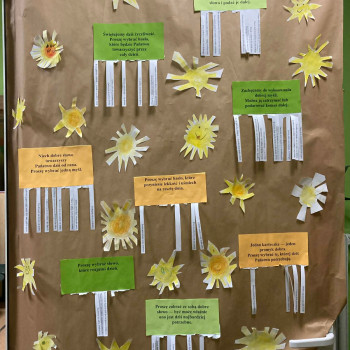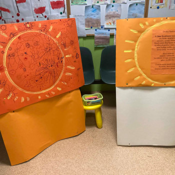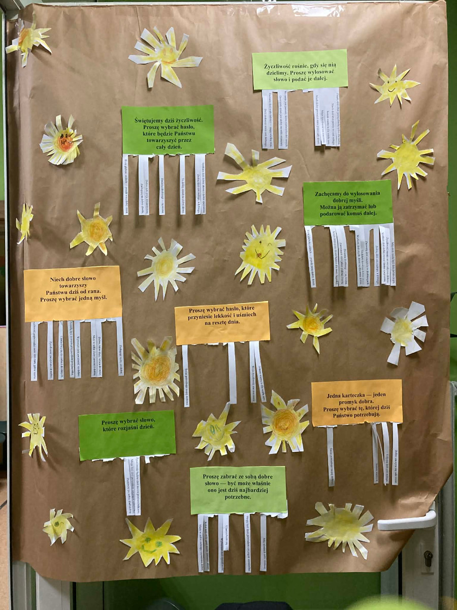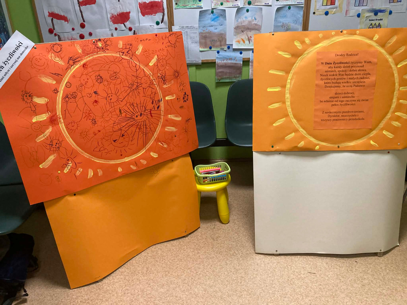 Dzieci z grupy III aktywnie włączyły się w przygotowania, tworząc tablicę pozytywnych myśli dla rodziców. Powstały piękne, kolorowe słoneczka, pełne ciepła i dobrych emocji.