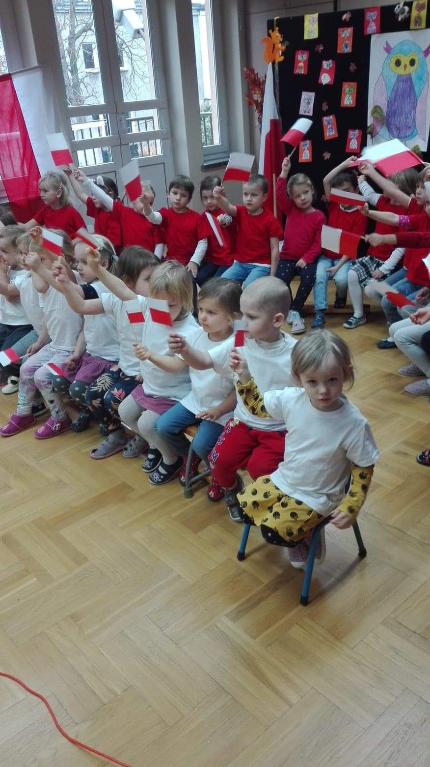 Dzieci były odświętnie ubrane w biało- czerwone barwy narodowe, trzymały w dłoniach własnoręcznie wykonane flagi.