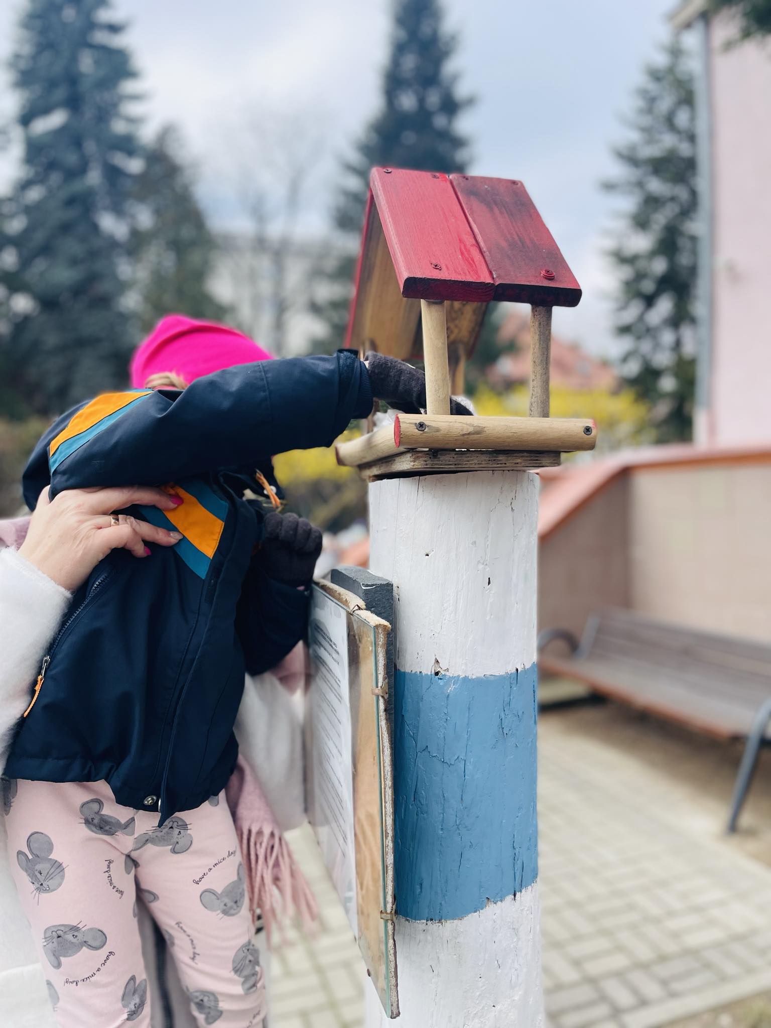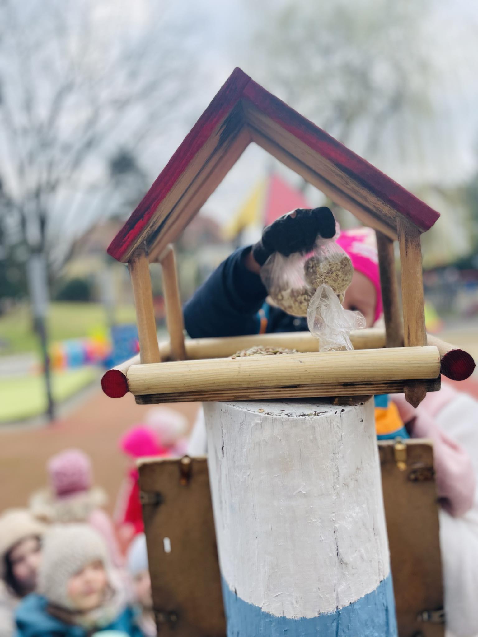 Gwiazdki dbają o to, żeby w karmnikach umieszczonych w ogrodzie przedszkolnym nie zabrakło pożywienia dla ptaków ?. Każdego dnia pamiętają o uzupełnieniu braków w ptasiej stołówce. Dokarmianie ptaków, szczególnie zimą, jest jedną z najbardziej rozpowszechnianych form ich ochrony. Dzieciom sprawia to ogromną radość ?.