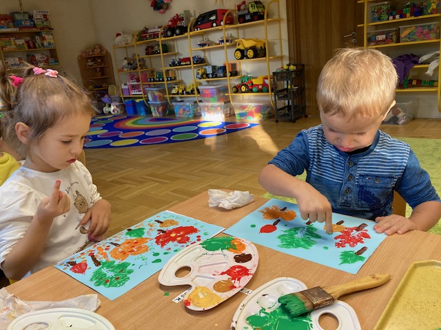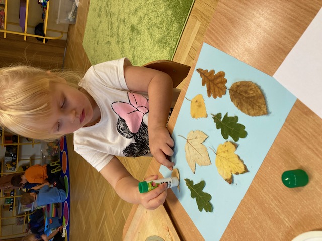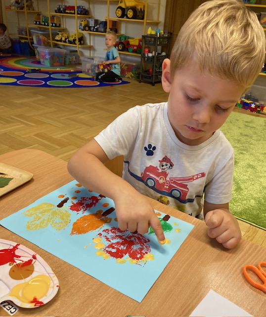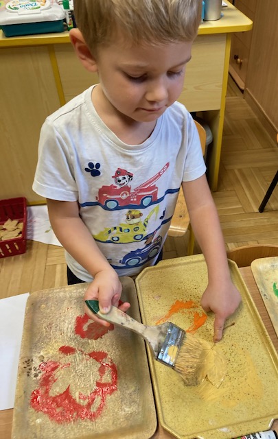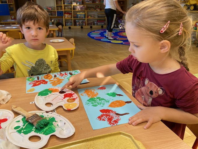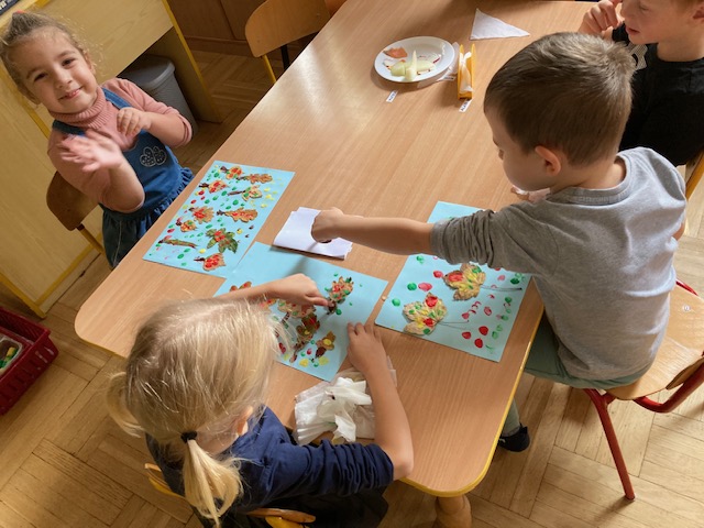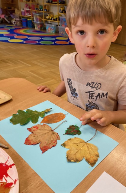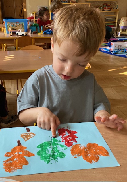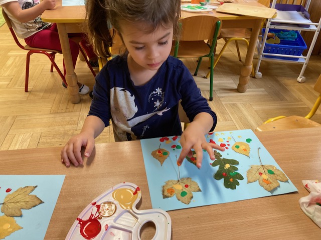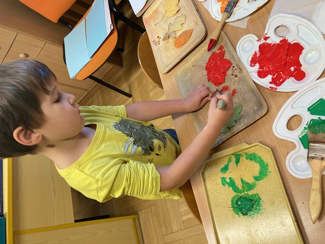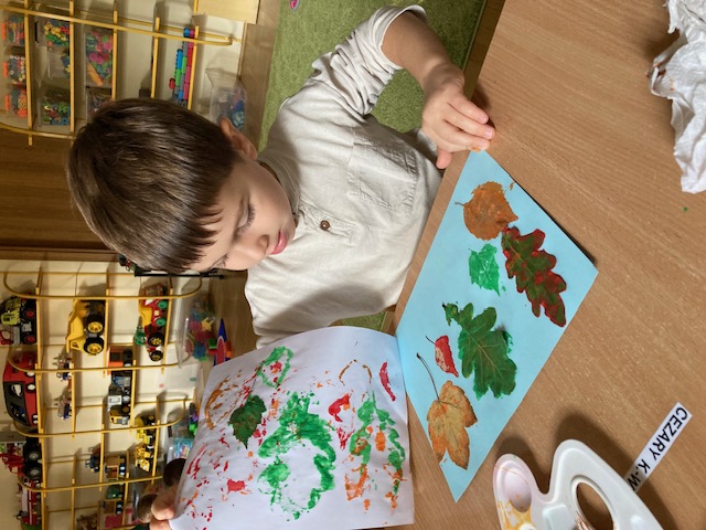 „JESIENNE  LISTKI”  - praca plastyczna z wykorzystaniem naturalnego tworzywa i utworu  muzycznego „Cztery poru roku - JESIEŃ”  Vivaldiego”. Wybór techniki - malowanie liścia farbą  i  odbijanie mocno dociskając drugą kartką od góry  lub przyklejanie liści , malowanie, stemplowanie palcami -  „Prawo do ubrudzenia się” .